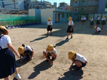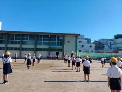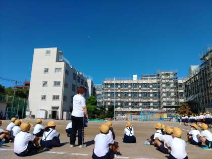昨日は、低学年はTeamsを使って教室で、高学年は運動場で全校朝会を行いました。校長先生のお話の後、運動会に向けて石拾いをしました。いいお天気で日射しがまぶしいなかでしたが、みんな一生懸命に拾っていました。朝会の後、4年生は残って月の観察をしました。太陽と月が同時に観察でき、みんなびっくり。握りこぶしを使って月の角度を測ったり、形を観察したりしていました。
