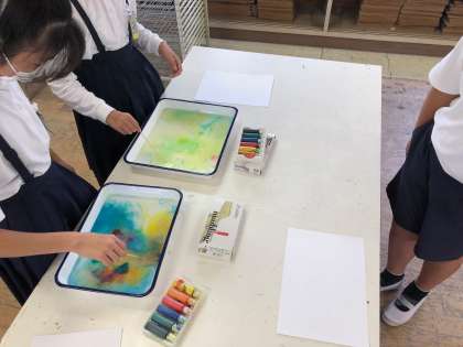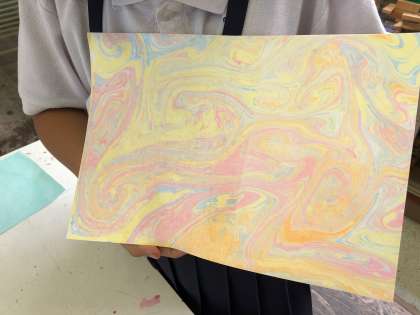 5年生の図工で、マーブリングをしました。マーブリング用の絵の具を垂らした水の中に画用紙をつけるだけで、まるで魔法のように一瞬でマーブル調の模様が出来上がり、子ども達はとても楽しそうに活動していました。この画用紙を作品の台紙に活用する予定です。