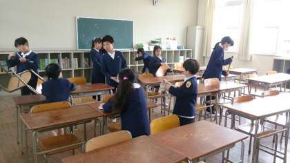 九条南小学校のよさは、異学年交流を通して児童自らが主体的に成長していけるところです。ぞうきんのしぼりかた、ぞうきんで拭く場所、ほうきの使い方などを丁寧に教えている高学年の児童の姿には頼もしさを感じました。