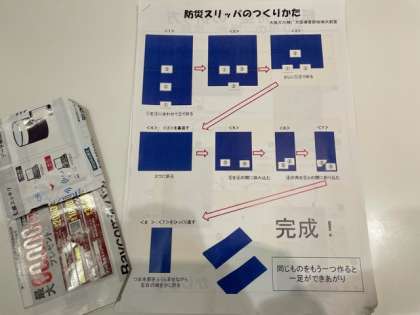 「考える防災教室」では、自分のことを自分で守るためにどのような行動をとればよいかについてクイズを交えてお話をしていただきました。過去の自然災害から自分の取るべき行動について考えました。また、ライフラインが止まった時に身の回りのものを使って代用する方法なども教えていただきました。最後にはチラシを使って、防災スリッパを作ってみました。