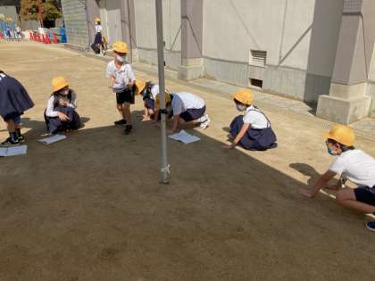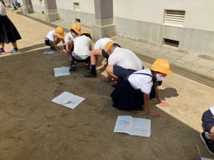 今日はとてもいいお天気。3年生の理科では、日なたと日かげの地面のちがいを観察しにいきました。予想をして、実際に地面をさわってみると、日なたは「あつい!」日かげは「わー少ししめっている!」と驚いたようすでした。