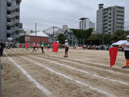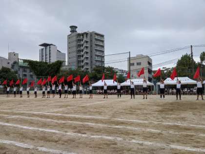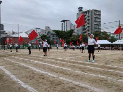 令和3年度運動会の最後のプログラムは、6年生による団体演技「一旗団結〜フラッグに込めた思い〜」でした。小学校生活最後の運動会、その最後を飾るにふさわしい6年生31名によるフラッグの演技です。力いっぱい振り切ったフラッグの音が一つに聞こえるほど、見事にそろった演技には、1年生から5年生の児童も感動したようすでした。みんなのあこがれとして輝く6年生は、のこり半年となった小学校生活で、さらに団結して、九条南小学校を支えていきます。