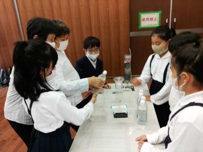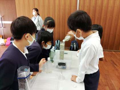 浄水場につくと、まずは「きれいな水ができるまで」を映像で学習しました。楽しい登場人物と音楽に、みんなの顔がほころびます。次に、グループに分かれて、浄水場で実際に使われている砂を使って、淀川の水がきれいになる実験や、粒状活性炭を使って臭いが吸着される実験をしました。ろ過されて、透明な水が出てくると「おお〜」っと歓声があがりました。