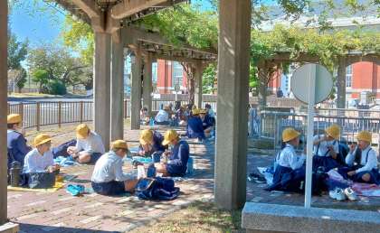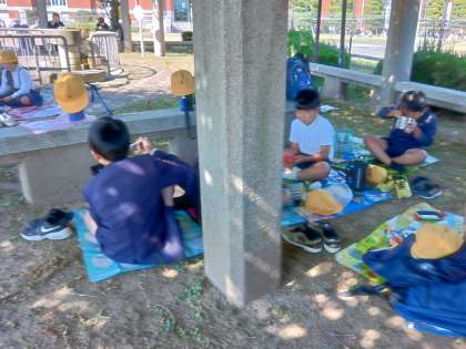 見学を終え、いよいよお弁当タイムです。USJよりも広い浄水場を見学して回ったので、みんなお腹がペコペコです。食べるときは黙食で、友だちと話をするときはマスクをしてからという約束で、お弁当タイムスタート。いつもは入れない水道記念館の広場でおいしくいただきました。土・日には、この記念館の建物の中にも入ることができるそうですので、ぜひご家族で行ってみてください。実際に見たり、感じたりすることが、子どもたちの学びには大切だなと改めて感じました。