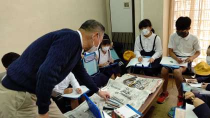 平野社長から会社の成り立ち、ネジの仕組み、ネジの種類などのお話をうかがいました。その中で印象的だったのは、九条の地域では、各会社が分業して、協力してねじ作りをしているという話です。また、ねじを1日に30万本作っているという話を聞き、子ども達は驚いていました。子ども達の質問にも丁寧にお答えいただきました。
