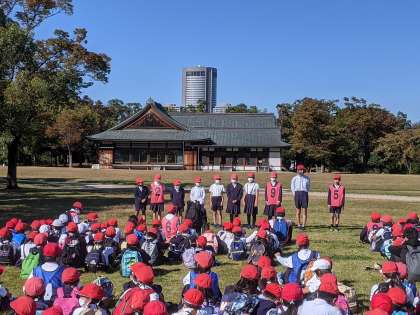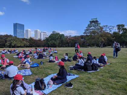 オリエンテーリングの後は、大阪城公園を一緒に回ったチームでお弁当を食べました。西の丸庭園はとても広く、チームごとに広がって芝生の上に敷物を引いて、おいしく食べました。いつもとは違って、広い外で食べたお弁当、子どもたちの顔に笑顔があふれていました。