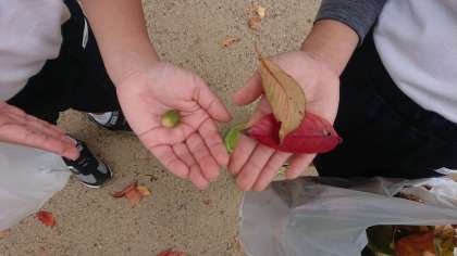 今日の1・2時間目に、九条南公園へ秋探しに行きました。赤や黄色の葉っぱを見つけたり、どんぐりを見つけたり、公園での「秋」を見つけることができました。