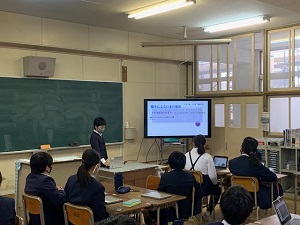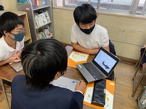 先週、ピースおおさかに社会見学に行き、戦争についての学習を深めた6年生は、自分達の知りたいテーマについて、タブレットや図書資料を活用して、調べたことをパワーポイントにまとめました。今日の総合的な学習の時間には、調べてきたことを各グループで交流しました。