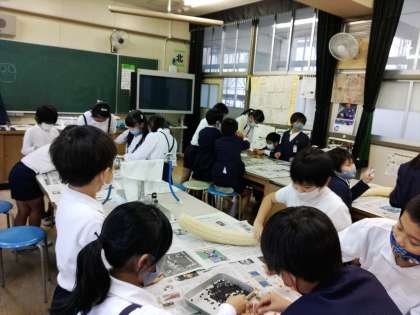 春から育ててきたヘチマ。びっくりするほど大きな実がたくさんできました。皮を乾燥させておいたものを、みんなで協力してはがしました。出てきたのは、何と!身の繊維(ヘチマたわし)と種。初めて見る子も多く、「スポンジみたい」「ふわふわしてる」と、驚いていました。