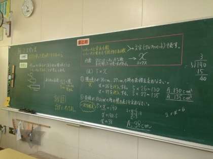 これまでは、□や○や△を用いて式で表すことは学習してきましたが、代数の基礎として、数量の大きさや数量の関係をxやyを用いて一般化することをねらいとしています。