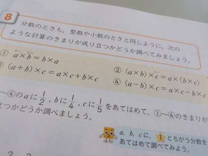 6年生の算数科では、この「文字と式」の学習以降、数式の性質や公式においては文字式が用いられています。中学校数学への接続を意識して、単元が配列されていることがわかります。