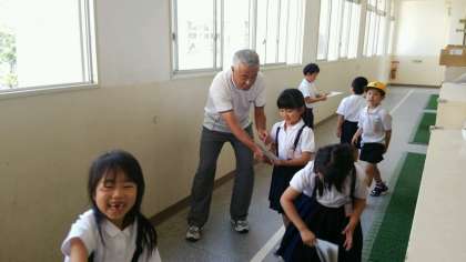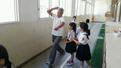 写真はその後の休み時間の一コマです。校長先生が廊下にいる子どもたちに、紙鉄砲を使って、ソフトボールの投げ方を教えてくださっています。「パーン!」という音に興味津々。音を鳴らすことができると上手く投げられるようになると聞き,手首の使い方、腕の振り等、楽しみながら投げ方のこつを身につけていました。