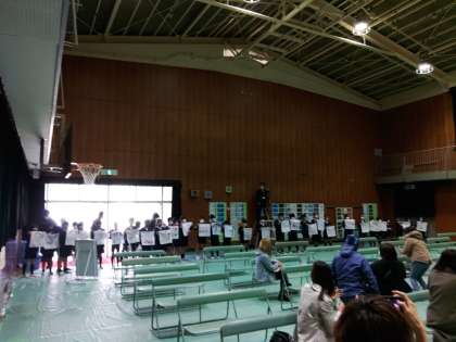 一人一人の夢をかいた「夢ハンカチ」を最後にみんなでジャーンと見せ、「にじいろ」の曲に合わせて退場しました。みんな、「やりきった」といういい表情をしていました。退場した後、津田先生の計らいでもう一度、講堂へ。おうちの方から拍手をたくさんもらって、子ども達の顔にも、にっこり笑顔が戻ってきました。今日までがんばってきた成果がしっかり発揮でき、成長が感じられた発表会になりました。