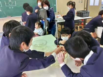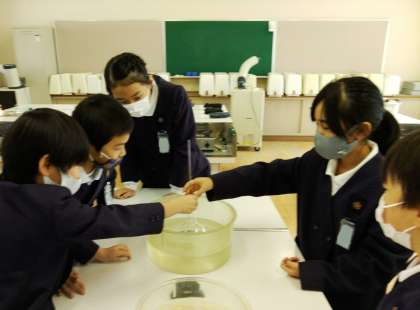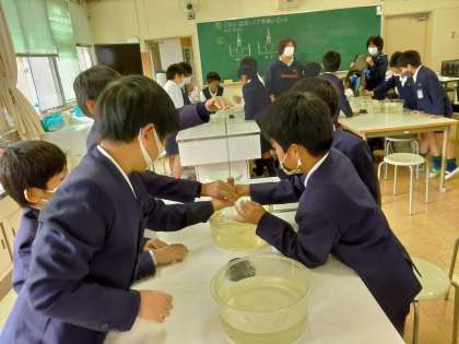 昨日に引き続き、空気を温めるとどうなるかの実験を班ごとに行いました。温めると、空気の体積が大きくなるのでは?という予想のもと、ガラス管の中にゼリーを入れて丸底フラスコに固定し、お湯と氷水につけてみます。すると…お湯ではゼリーが上へあがってきて、氷水では下に吸い込まれていきました。空気が膨らむスピードが速すぎて、ゼリーがガラス管から飛び出してしまう班が続出で、子どもたちは大盛り上がり。実験は大成功で、空気が膨らむ様子を実感できたようです。