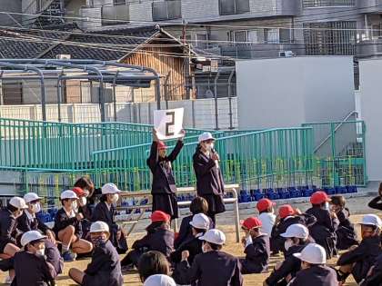 本の作者や登場人物を当てる3択クイズです。「1番だと思う人は帽子を赤に、2番だと思う人は帽子を白に、3番だと思う人は帽子を取ってください。」という図書委員会のメンバーのアナウンスで皆、一斉に帽子をひっくり返したり、取ったりとクイズの答えを考えて、楽しいひとときを過ごすことができました。