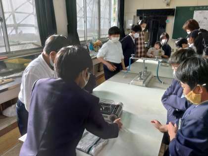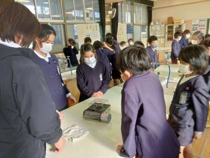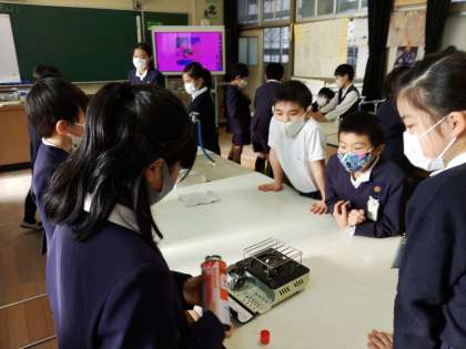 次の金属を温める実験では火を使うので、今日は、火を点ける練習をしました。実験用コンロにカセットボンベを取り付け、つまみをひねって火を点けて消すところまで、一人ずつ順番に練習します。カセットコンロを使っているご家庭も多いので、慣れた手つきで火を点ける子もいれば、つまみを回すのも恐る恐るという子もいました。昔は、アルコールランプだったのに便利な世の中になったなあと、感慨深いものがありました。