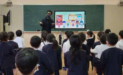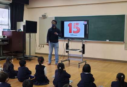 1年生の外国語活動では、挨拶をしたあと、20までの数の学習をしました。11から20は、難しく繰り返し練習しました。また、けしごむや鉛筆など身の回りの文房具の英語も教えてもらいました。絵を見て、数を答えるゲームなどをして、楽しく学習することができました。