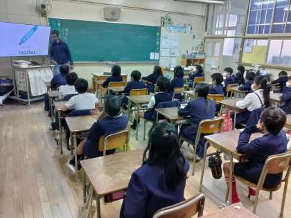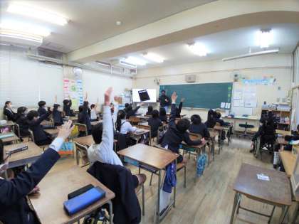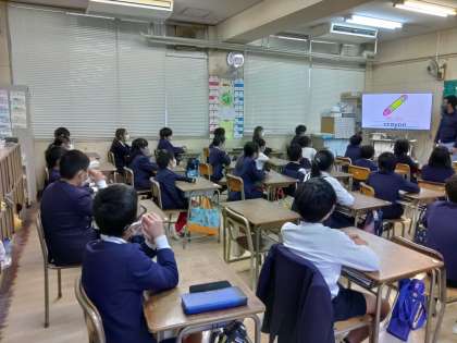 今日は2学期最後のモリス先生との英語活動がありました。4年生では、文房具の名前を英語で言う学習をしています。初めは、絵を見ながら何度も練習し、最後は文房具の「シルエットクイズ」をしました。みんな「わかった」「あれや!」とすぐに分かり、たくさん手が挙がっていました。