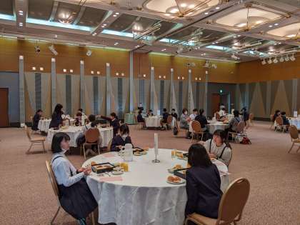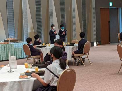 スクランブルエッグにウィンナー、魚フライに皮付きポテトフライ、焼きそばにブロッコリー、野菜サラダにコーンスープ、クロワッサンにソフトロール、グレープフルーツにオレンジジュースととってもボリューミー!