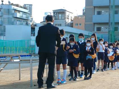 今日は全学年が運動場にそろって、2学期最後の朝会があり、読書感想文コンクールの表彰と、読書記録達成の表彰が行われました。校長先生から、一人一人に賞状が手渡されると、みんなからの温かい拍手が運動場に響きました。