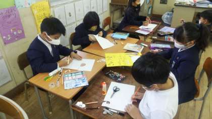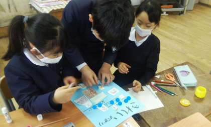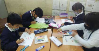 3学期が始まり、新しい係活動のメンバーが決まりました。それぞれの係で集まって、係の活動がわかるようなイラストを描いて、貼り付けています。