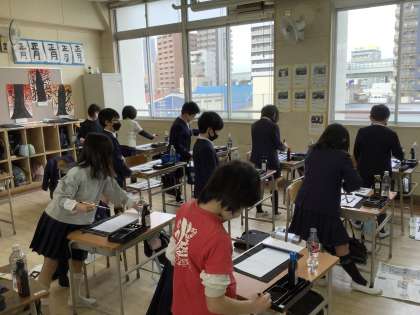 3年生書写(毛筆)では、何度も半紙で練習を重ね、初めて長い書き初め用紙に筆でかきました。立って書くのも初めてです!!