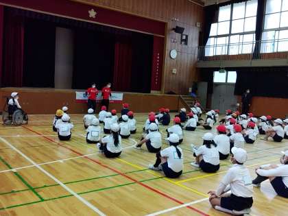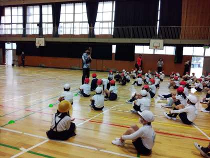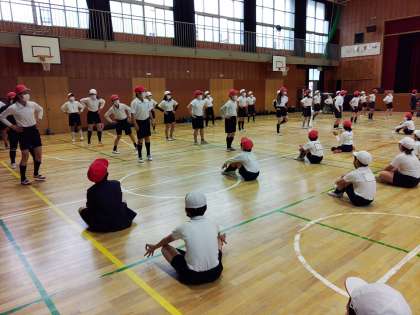 まず初めは、ダンスから。難しい動きもありましたが、教える方の話術で、みんなノリノリで踊っているうちに、あっという間に1時間が過ぎてしまいました。次は、いよいよ運動場!と思って出てみると急に雨脚が激しくなり、残念ながら、4時間目も講堂での活動になりました。けれども、運動場よりも近くで指導をしていただけて、良かったかもしれません。