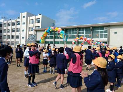 次は、在校生から6年生へのプレゼントです。1年生から5年生が協力して、メッセージカードを作りました。たてわり班でお世話になった6年生へ、メッセージカードを渡しました。