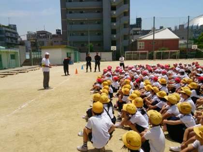 今日の避難訓練は、地震の発生に伴い運動場へ1次避難。