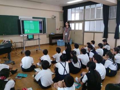 授業の初めに、これまでに学んだ表現をもとに、色に関する歌を歌ったり、英語の絵本を暗唱したりしました。