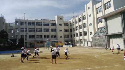 1組も2組もそれぞれのコートに分かれて、試合が始まりました。気温も高く、暖かくなり子どもたちの動きも活発になってきました。皆、自分が得点を決めたくて必死ですが、パスを回しあってゴール(得点)に近づくこともできるようになってきました。試合形式は一番盛り上がります。