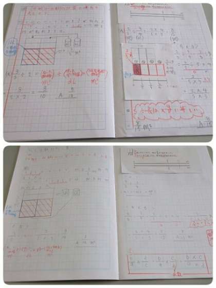 分数のかけ算のときと同様、面積図を用いて、みんなで(分数)÷(分数)計算のしかたについて話し合いました。