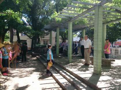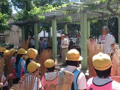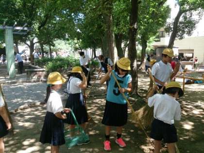 時折風の吹きぬける、さわやかな気候の中、たてわり班で助け合いながら清掃活動に勤しんだ子どもたち。