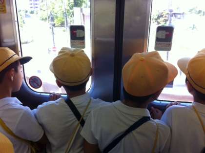 まずは、環状線一周。弁天町駅をスタートし、電車の窓から大阪市の様子の変化を調べました。「この辺りは工場が多いね。」「大きいビルがたくさんあるな。」などたくさんのことに気が付くことができました。