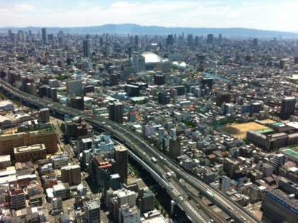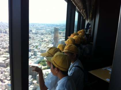 次は、ベイタワーホテルの方に協力していただき、51階のレストランから大阪市の様子を調べました。西側の海の近くには、たくさんの住宅や倉庫があることがわかりました。東側は九条南の町を一望できるだけでなく、大阪駅周辺に高いビルがたくさんあることもよくわかりました。