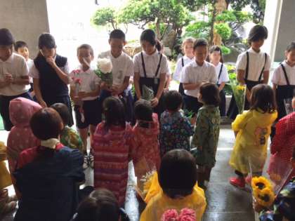 雨の中、福音幼稚園の園児が本校を訪れ、からすてきなお花のプレゼントをしてくれました。児童会の運営委員のメンバーが本校の児童代表として受け取り、「ありがとうございます。」とあいさつをしました。幼稚園の子どもたちを前にすると、自然と笑顔になるほほえましい場面でした。