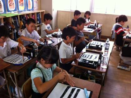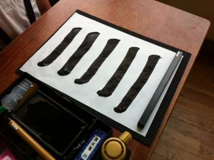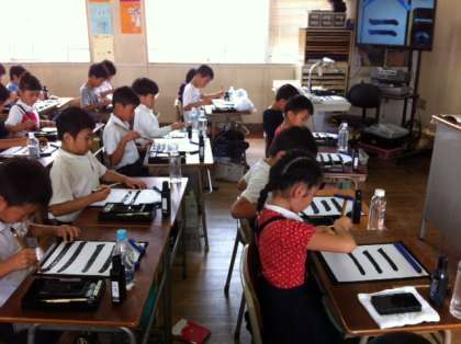 前回は、習字の道具の準備の仕方、筆の持ち方、片付け方を学習をしましたが、今回は墨汁を使ってかきました。おそるおそる墨汁をつけると筆を立ててかき始めました。