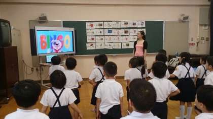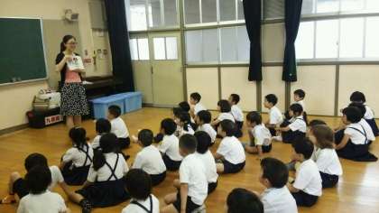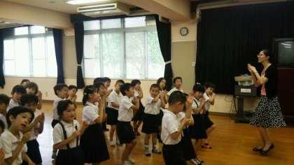 写真は「早寝 早起きの歌」を歌い、踊っています。毎回素敵な音楽に合わせて、楽しく英語を身に着けています。声に出し、身振り手振りをつけて表現することに歓声があがります。今日は「数」「アルファベット」についても学習しました。