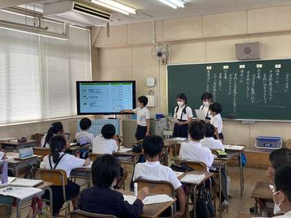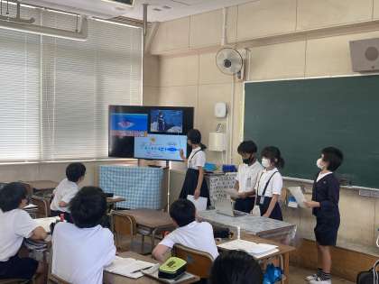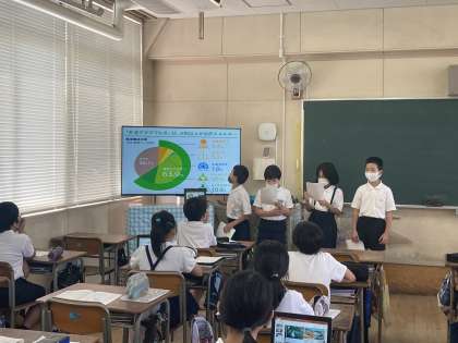 国語科「環境問題について報告しよう」の学習では、「海洋ごみ問題」や「再生可能エネルギー」、「外来種」など環境をテーマにした問題について各グループで調査し、調べたことをまとめて報告会を開きました。この学習では「資料を活用する」ことをテーマに、自分たちの発表内容に合った資料を探し、より分かりやすく、より説得力のある報告にするためにそろぞれのグループで工夫しました。