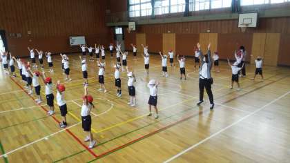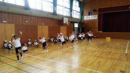 新体力テストの「ソフトボール投げ」に向けて、今日は少し軽めのボールを対面の壁に向かって、投げる練習をしました。床にたたきつけてしまわないように、斜め上に向かって投げます。何度も繰り返して、だんだんできるようになってきました。がんばれ1年生!