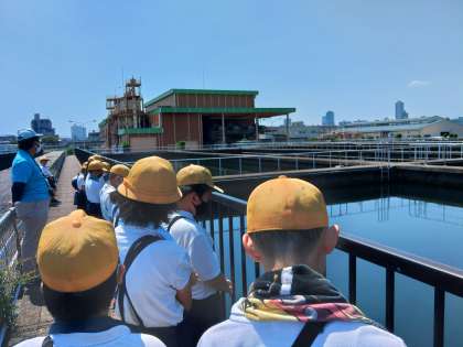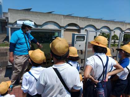 今日は、柴島浄水場に社会見学に行きました。九条から西中島南方まで地下鉄に乗った後、歩いて浄水場に到着しました。初めに、水かきれいになるまでの仕組みを動画で確認します。その後、実際に見学に出かけました。汚れが下に溜まり、だんだん水がきれいになっていく様子を実感することができました。暑い中でしたが、見学の順序やマスクの着脱など、係の方が工夫してくださったので、全員元気に回ることができました。
