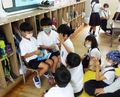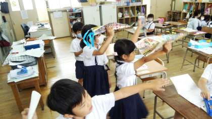 紙芝居係さんは紙芝居を、クイズ係さんはクイズの出題を、制作遊びが好きな児童は紙飛行機を折って楽しんでいます。その他にも、粘土遊びやイラスト描きなどをして賑やかです。雨の日の20分休みは図書館開放もしているので、本の返却・貸出に出かける児童も多くいます。