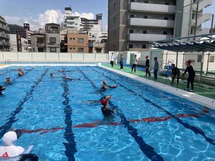 水泳の時間にもしもの水難事故に備えて、着衣泳の学習を行いました。水着のときとの違いを実際に感じながら、水の中で泳いだり潜ったりしました。泳ぐことの難しさを実感した後は「浮いて、待つ」を合言葉に、ペットボトルに捕まって長い時間浮くことができるように工夫しました。