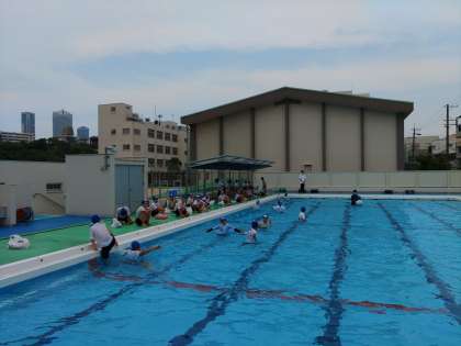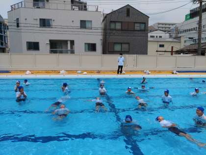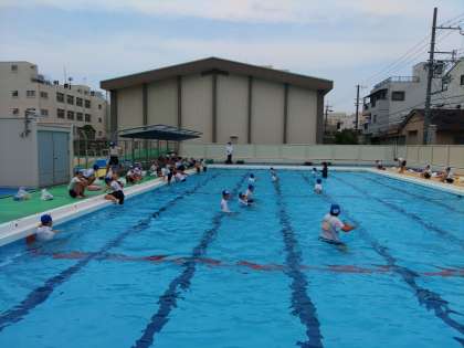 今日は、水の事故から命を守るための「着衣泳」を行いました。シャワーを浴びて、水慣れをした後、水着の上から体操服を着ます。服を着てプールに入り、まずは前向きで歩いたり、後ろ向きで歩いたりして、どの歩き方が進みやすいかを試してみました。次に、上を向いて浮かぶ練習をしました。何度も練習するうちに、だんだん浮かべる子が増えてきました。服の中に空気を入れて膨らませたり、ビート板などの浮かぶものを持ったりすると浮かびやすいことが実感できました。実際にやってみることで、子どもたちの経験値がまた1つアップしました。