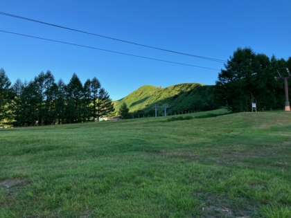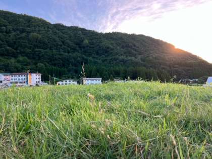 宿舎「やまとよ」と日の出、朝日に映える高丸山