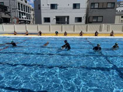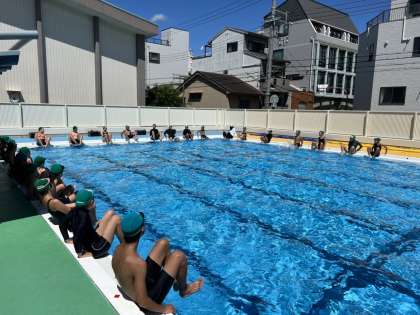 クロールが泳げるようになったので、今回は平泳ぎを教えてもらいました。平泳ぎはクロールと違い足の動かし方がとても大切だとおっしゃっていました。プールサイドに座り足の動かし方をとてもわかりやすく教えていただきました。子どもたちは、「今まで平泳ぎはしたことがなかったけど、少し泳げるようになった。」ととても嬉しそうにしていました。