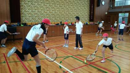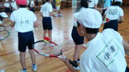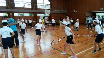 九条北小学校で行われたテニスクリニックに参加しました。ラケットを持つのも初めてという子どももいたのですが、8人のコーチの分かりやすくて優しい指導のもと、子どもたち全員が楽しい時間を過ごすことができました。子どもたちの上達は早く、最後には1対1でコーチとミニラリーができるまでになっていました。テニスのおもしろさをたっぷり味わい、興味がわいた子どもたちも多かったのではないでしょうか?秋には、靭テニスセンターで開催される大阪市長杯 2015世界スーパージュニアテニス選手権大会(10/10〜10/18)を観戦したり、キャリア教育の一環としてバックヤードで働いているスタッフの活動も見せていただいたりする予定です。
