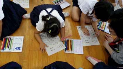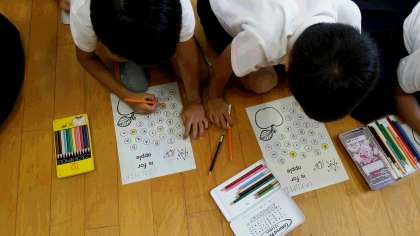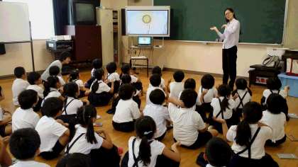 2年生になって3回目のC−NET。いつもの楽しい歌だけではなく、英語の文字、アルファベットの学習もしました。今回は「A」「a」、「B」「b」をしました。大文字小文字と両方を学習しました。まずは、色を塗り分けて、そして、書き順・書き方に気をつけて書きました。思っていた以上に上手にアルファベットを書く子どもたちに感心しました。これからの活動も楽しみです。