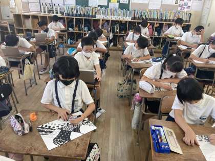 5年生の教室には、サインペンのこんこんと描く音が響いています。図画工作科では「線でアート」という作品の制作に取り組んでいます。サインペンのみで仕上げるこの作品は、真っ白な画用紙にサインペンで様々な模様や柄を描くことで、白と黒のコントラストを生み出していきます。身の回りにある文房具などを使って、工夫して、集中して没頭していました。