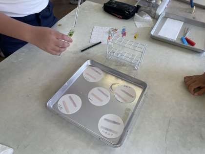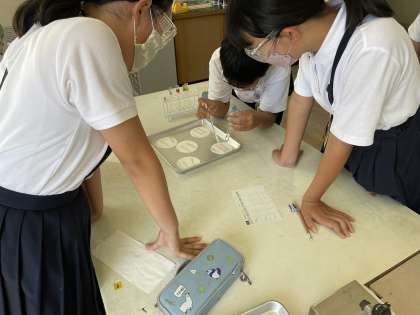 6年生は、理科で水溶液の性質について学習しています。今日は、リトマス紙を使って5種類の水溶液が酸性・中性・アルカリ性のどれなのかを実験をして調べました。保護メガネをつけて安全に気を付けて実験をしていました。